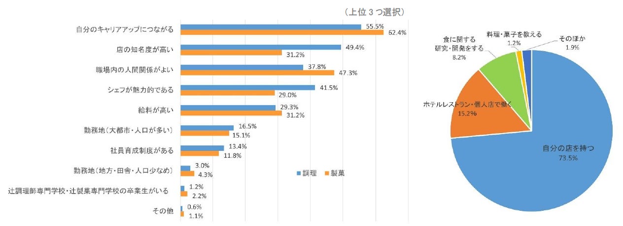 日本での就職を希望する留学生は65.4%と昨年より3.4ポイントアップし、「まだまだ日本で経験を積みたい」「自分の技術をもっと磨きたい」と希望するコメントが多く見られました。就職先を選ぶ基準については、料理・菓子を学ぶ学生に差異はあるものの、「自身のキャリアアップにつながるかどうか」が最も重要視され、次いで「店の地名度」「職場内での人間関係」があげられました。料理を学ぶ学生にとっては、「シェフが魅力的である」ということも大きなポイントとなっているようです。(下左図参照)