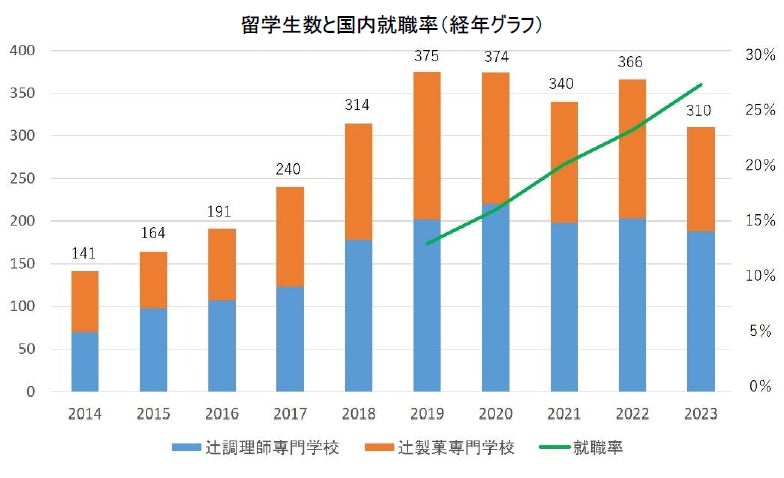辻󠄀調理師専門学校、辻󠄀製菓専門学校(大阪市、校長:辻󠄀芳樹)には、2023年度入学の留学生が155名、進級した在校生と合わせて合計310名の留学生が在学しています。新型コロナウイルス流行のため2020年より日本の語学学校などへの留学が減少していたことから、本学への入学者数にも少なからず影響が出ている状況ですが、日本での就職希望者は増加し、国内就職率は堅調に伸びています。(下図参照)
