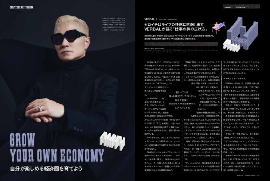 アーティストであり、ファッションブランドAMBUSH®︎ CEO、最先端の表現に挑戦するイノベーターとして活躍するVERBAL。彼が語る「仕事の枠の広げ方」を皮切りに、新しい働き方とそれを楽しむ生き方を伝授するVERBALと経済学者の成田悠輔の特別対談、史上もっともビリオネアに近い米YouTuberの誕生秘話、さらに日本でいま注目のクリエイター100組のキャリアは一挙に掲載しています。