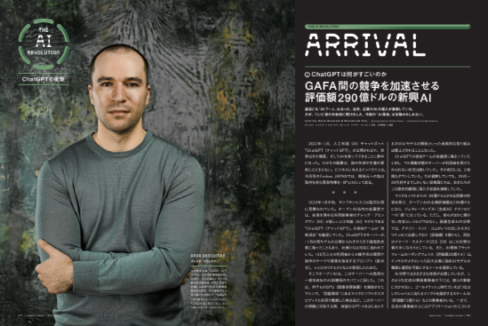 特集の「ChatGPTの衝撃」は、ChatGPTをつくったサム・アルトマンのインタビュー、ChatGPTによってグーグルを打ち負かそうとするマイクロソフトなど、GAFAMの時代が大きく崩れていく様子を現地からレポートします。
