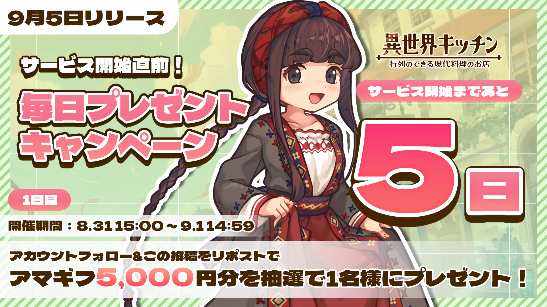 『異世界キッチン 行列のできる現代料理のお店』公式X(旧Twitter)上で本ゲーム公式アカウントをフォローした上で、5日間毎日投稿される該当ポストをリポストすると抽選で1名様に5,000円分のAmazonギフト券が当たります。