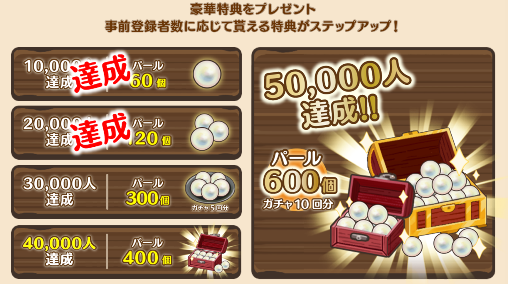事前登録者数に応じてゲーム内でガチャが引けるアイテムを全員にプレゼントいたします。