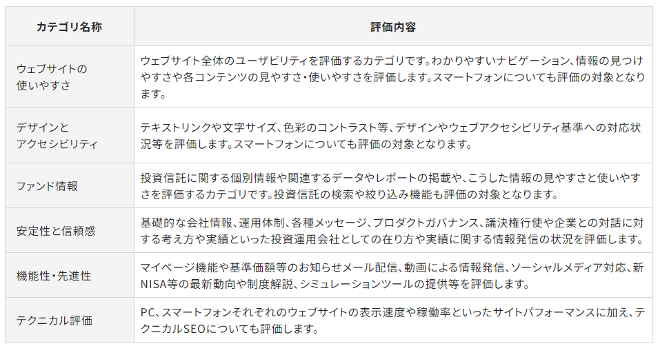 こうした社会的使命を踏まえ、資産運用会社には、運用力の強化や顧客本位のビジネス運営に加えて、説明責任、スチュワードシップ、サステナビリティ対応の高度化が求められています。これらの動向を踏まえ、本ランキングでは、従来のサイト全体のユーザビリティや商品情報の充実度に加え、プロダクトガバナンス体制、運用プロセスの透明性、運用責任者・チームの専門性、サステナビリティおよびフィデューシャリー・デューティーへの対応など、信頼性と説明責任の観点をより重視して評価しています。