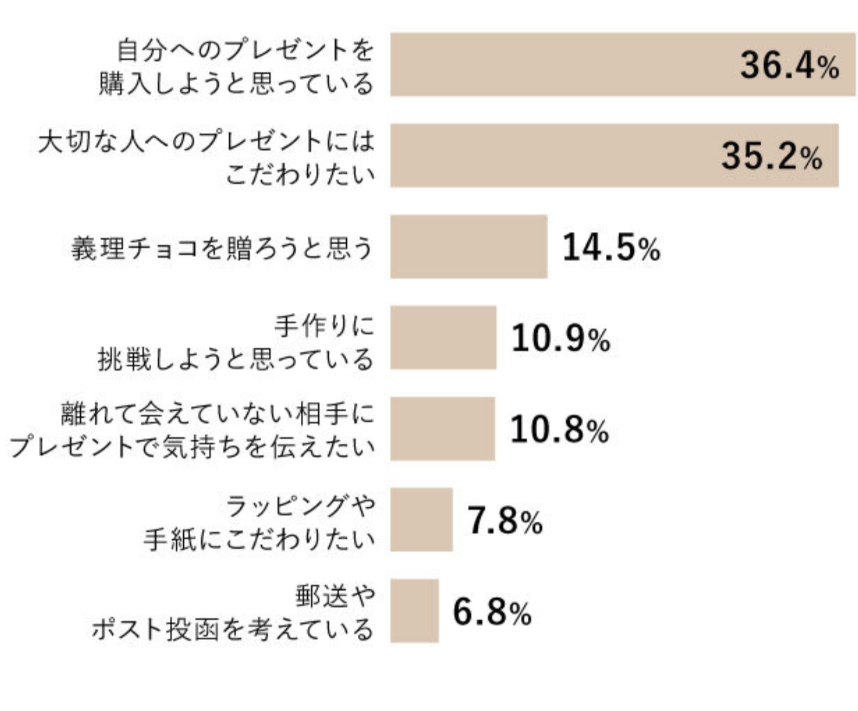 - 「義理チョコを贈る」は昨年の31.8%から14.5%へ。大切な人や自分にこだわりのチョコ・プレゼント贈りたいという人が多数派