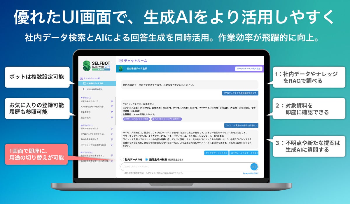 優れたUIで、生成AIを社内でより活用しやすく。新機能&UIをリリース。SELFBOT社内利用(高精度の生成AI)
