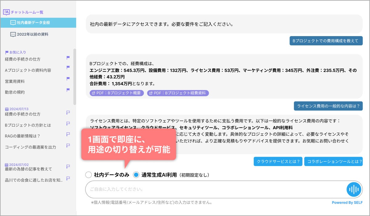 SELFBOTは、社内ドキュメント検索(RAG)と生成AI(LLMによる回答生成)での利用を別の画面で行う非効率さを解消。1クリックで「RAGによる社内データ検索(生成)」と「GPT-4oによる回答生成」を切り替えることができる新UI(ユーザー・インターフェース)をリリースしました。
