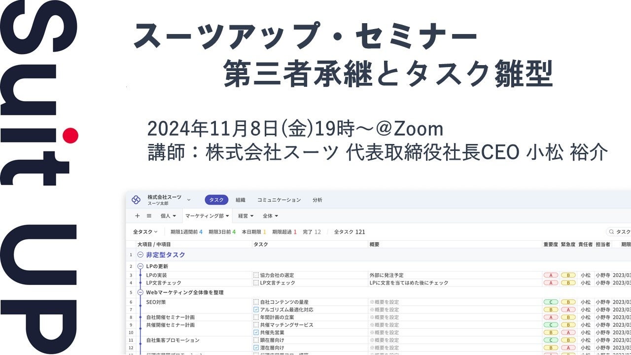 株式会社スーツ(所在地:東京都千代田区、代表取締役社長CEO:小松 裕介)は、2024年11月8日(金)19時から、当社代表の小松が講師を務めるスーツアップ・セミナー「第三者承継とタスク雛型」を無料開催します。
