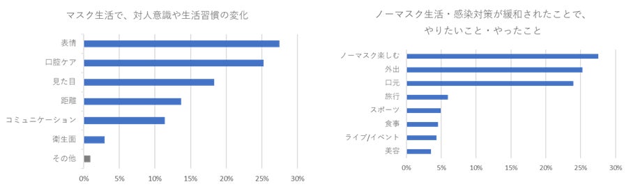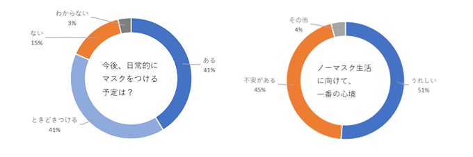 新型コロナの5類移行によるノーマスク生活について、全体の51%が脱マスクは「うれしい」と回答。「マスクの着用が個人の判断になったこと」「息苦しい時にマスクを外すことができること」など精神的な安心感を得ている人が多く、また全体の45%は、脱マスクについて「不安」と回答した。理由としては「メイクなど面倒」「ヒゲ剃りをさぼれなくなる」「顔を覆うことに慣れすぎた」「マスクがファッション的要素のためトータルバランスが崩れる」など回答しており、感染対策としての面ではなく、ケアの手間について不安を感じている人が多いことがわかった。