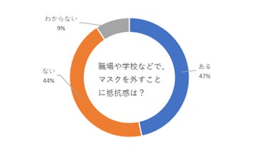 「職場や学校などで、マスクを外すことに抵抗感があるか」という質問に対しては、約半数が「まだ抵抗感があ る」と回答。医療従事者やサービス業など不特定多数の人と関わる業種や、高齢者の方と関わる職種においては、今後も継続してマスク着用が必要と感じている。