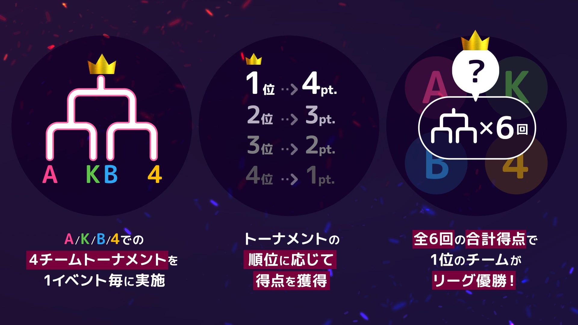 ・対戦形式:各イベントでA/K/B/4の4チームでトーナメントを実施。全6回の合計ポイントで優勝チームが決まります。