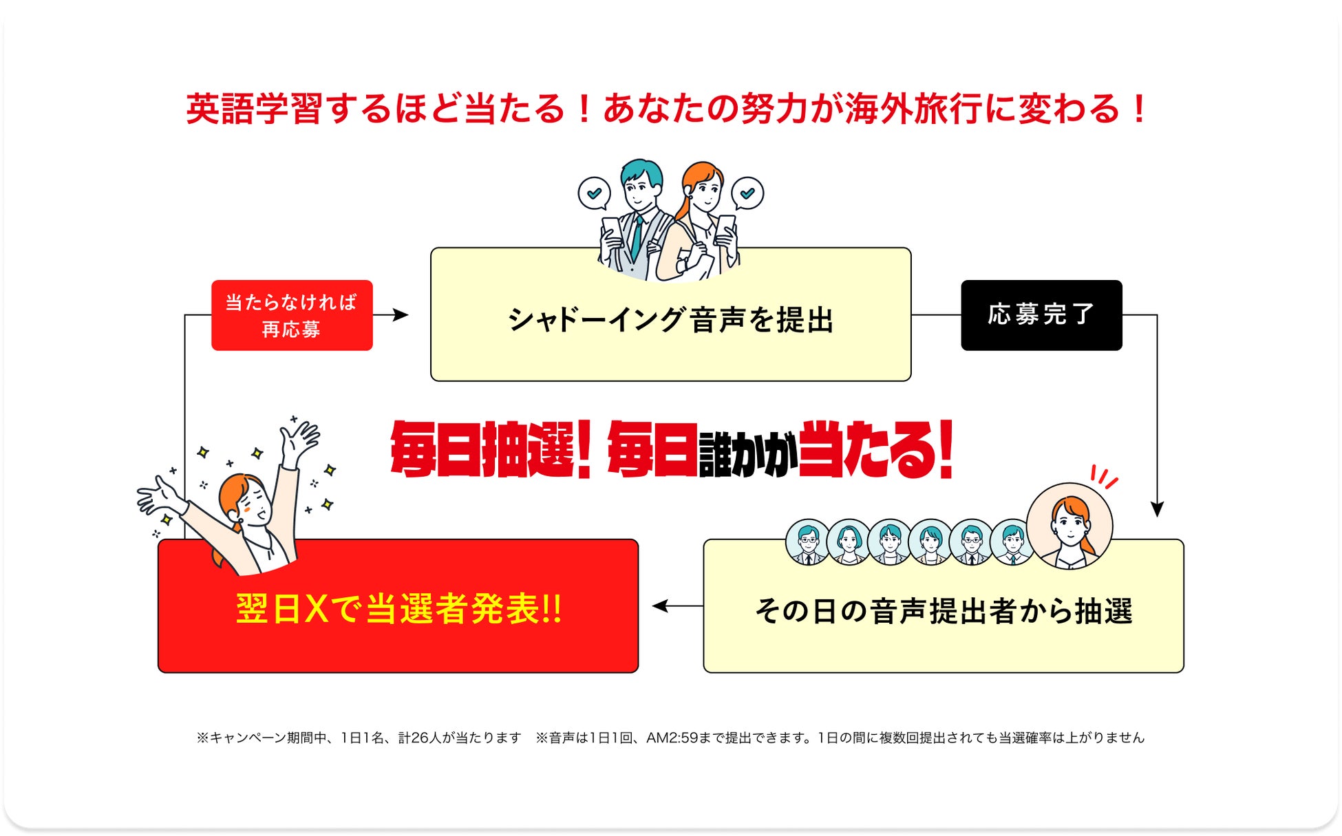・音声は1日1回、AM2:59まで提出できます。1日の間に複数回提出されても当選確率は上がりません。