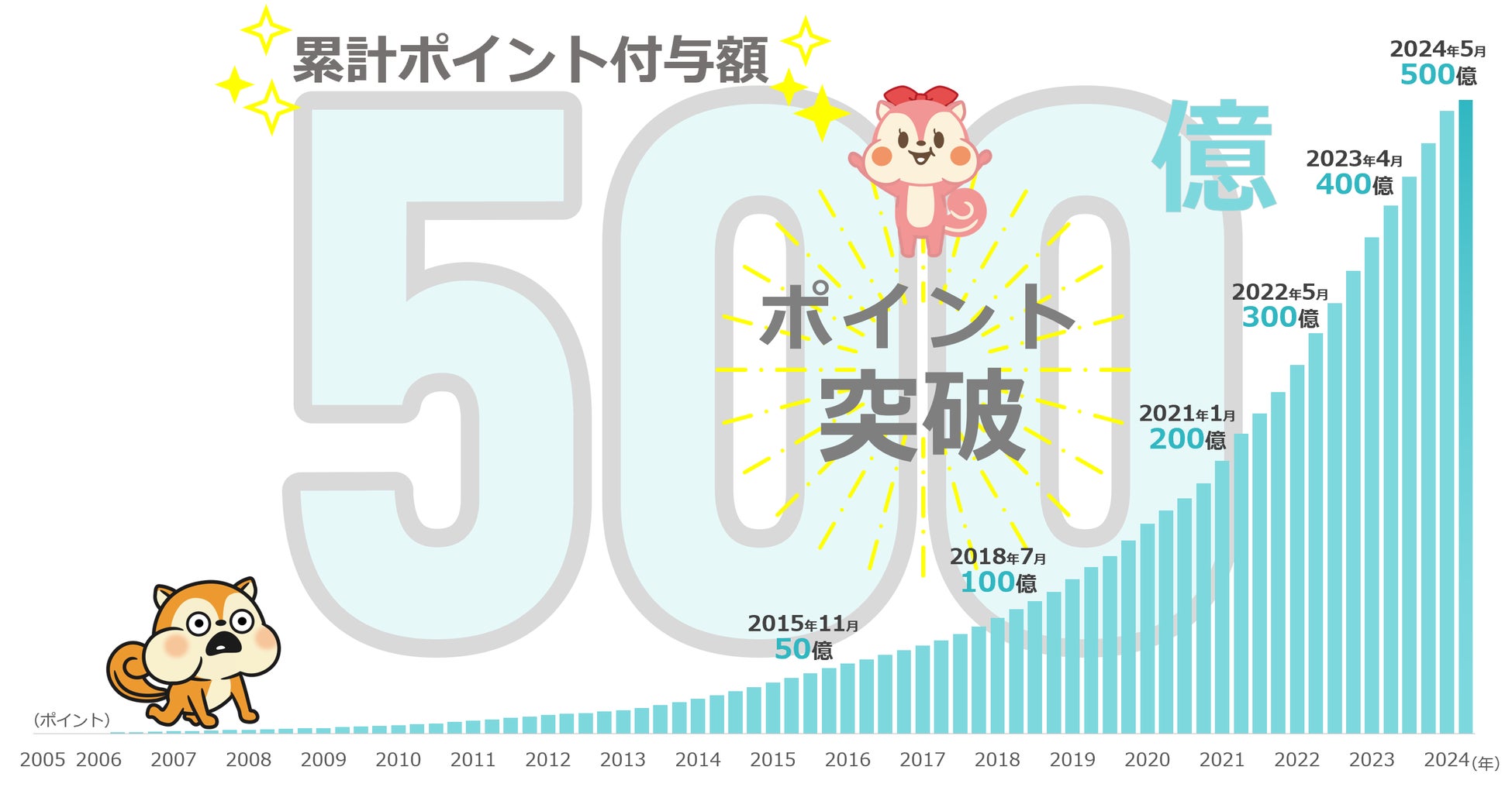 一方、「モッピー」のポイント付与額は、2022年に300億ポイント突破以降、約1年で400億ポイントを突破、さらに1年後の2024年5月、500億ポイント突破し、安定的に多くのユーザーに利用されています。