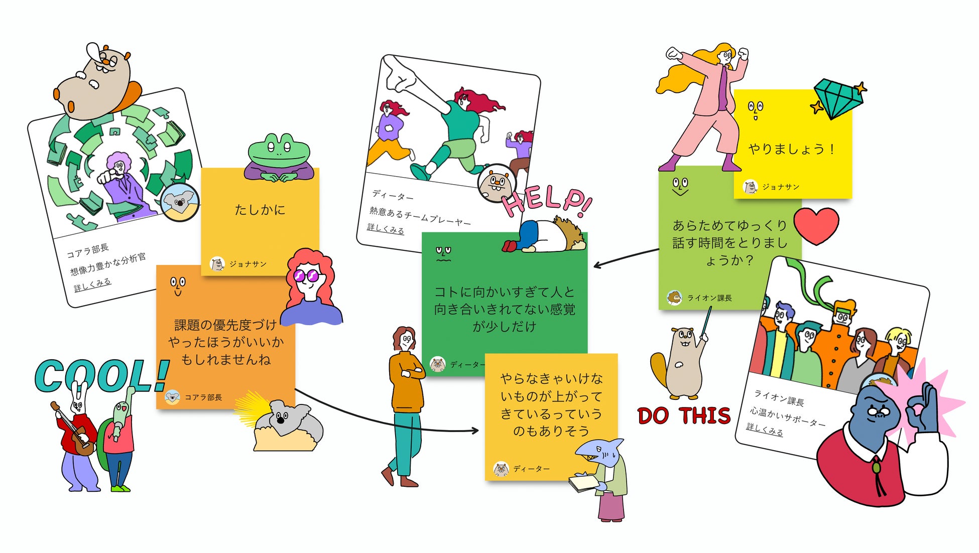 Wevox上の様々なデータと連動しているWevox Boardでは、ボタン一つで簡単に自チームのエンゲージメントスコアを出力したり、各メンバーの特性タイプを表示したり、キモチ付箋で感情を交えたり、テンプレートを元にゲーム感覚で対話ができたり、多彩で質の高い対話をチームみんなで楽しむことが可能です。