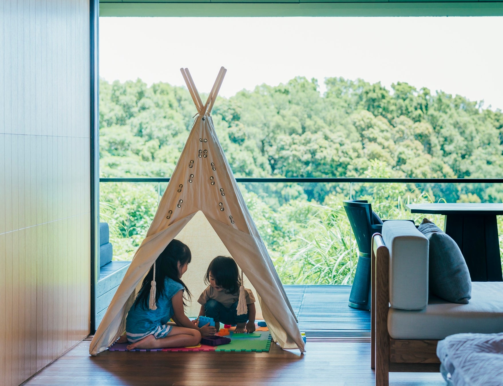 また、お子さまとのご滞在には、キッズテントやバードウォッチング用の双眼鏡、お部屋での映画鑑賞用にプロジェクターなどもご用意が可能です。ご希望に応じて、「キッズアカデミープログラム」より、タオルアート体験、あるいはカート乗車体験も無料でお楽しみいただけます。