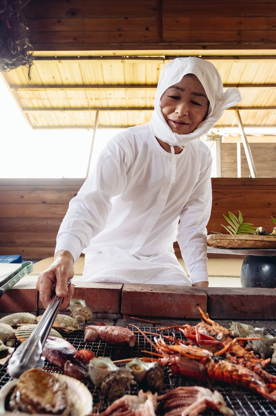 日本で一番海女さんが多い、伊勢志摩ならではの体験をお届けします。漁の後に暖を取る「海女小屋」で、現役の海女さんが目の前で焼いてくれる新鮮な「海鮮グリル」と、興味深いお話をお楽しみください。アマネムの正面に見えるさきしま半島内の志摩町越賀にある「さとうみ庵」は、地元の人のみ知る、あづり浜のすぐそばにあり、海女小屋でのひとときの後は散策もおすすめです。