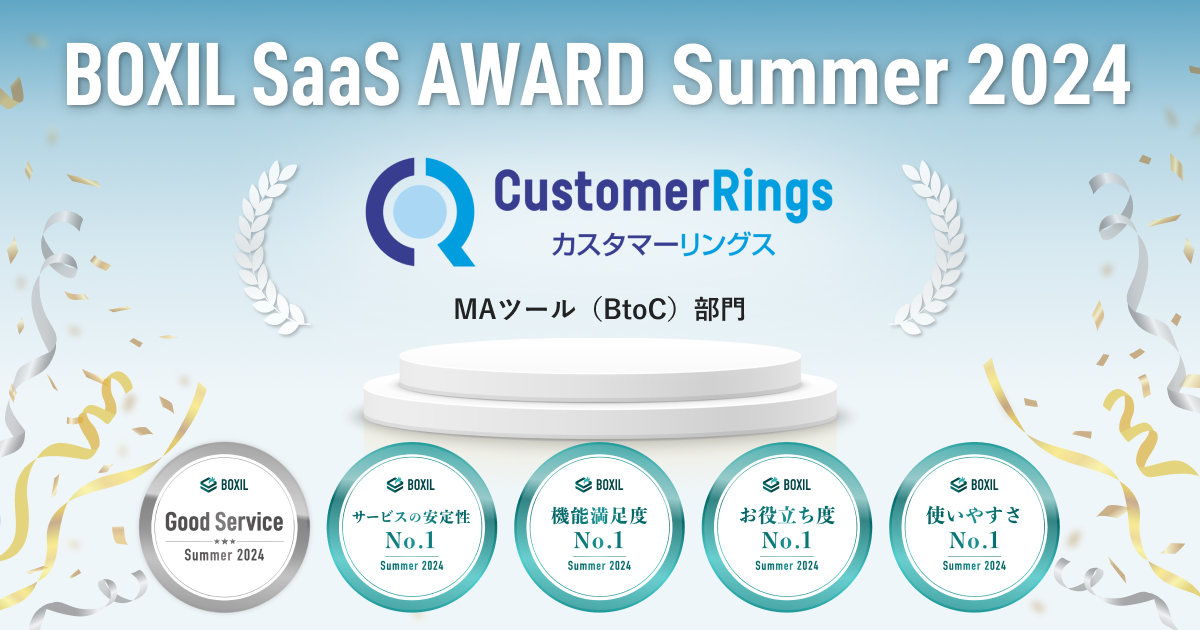 「BOXIL SaaS AWARD(ボクシル サース アワード)」とは、SaaS比較サイト「BOXIL SaaS(ボクシル サース)」を運営するスマートキャンプが、優れたSaaSを審査、選考、表彰するイベントです。今回の「BOXIL SaaS AWARD Summer 2024」は、2023年4月1日〜2024年3月31日までの1年間に「BOXIL SaaS」上へ新たに投稿された口コミ約18,000件を審査対象としています。今回「カスタマーリングス」はMAツール(BtoC)部門にて下記を受賞いたしました。