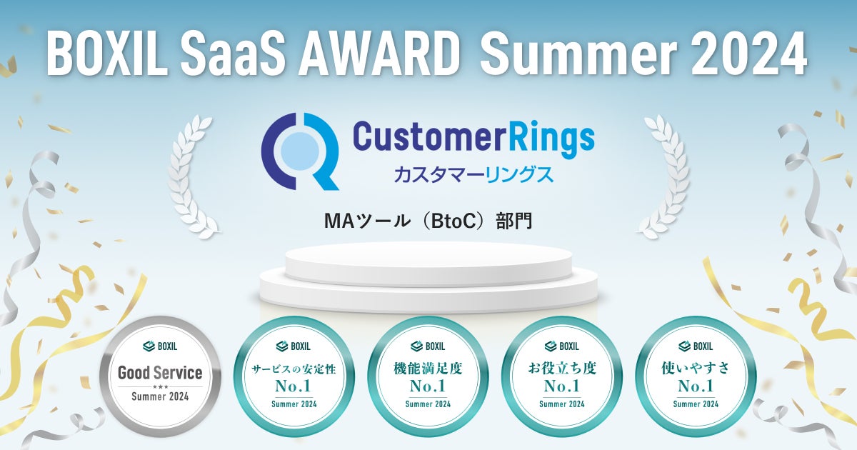 株式会社プラスアルファ・コンサルティング(本社:東京都港区、代表取締役社長:三室克哉 証券コード:4071))が提供するCRM/MAツール「CustomerRings(以下:カスタマーリングス)」はSaaS(※)比較サイト「BOXIL SaaS(ボクシル サース)」を運営するスマートキャンプ株式会社(本社:東京都港区、代表取締役:林 詩音、以下「スマートキャンプ」)が実施する、「BOXIL SaaS AWARD Summer 2024」のMAツール(BtoC)部門におきまして、Good Service、サービスの安定性No.1、機能満足度No.1、お役立ち度No.1、使いやすさNo.1の5つの賞を受賞したことをお知らせいたします。