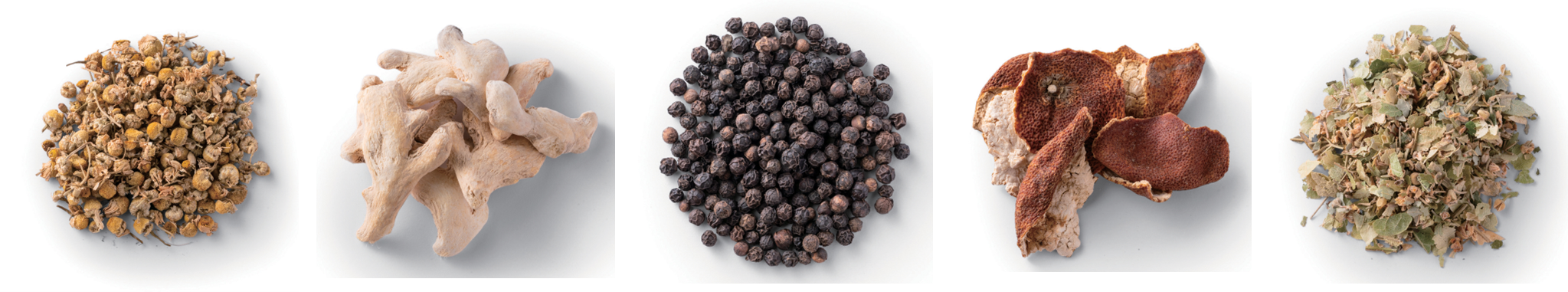 5種のハーブ(左から、カモミール、生姜、ブラックペッパー、オレンジピール、リンデンフラワー)