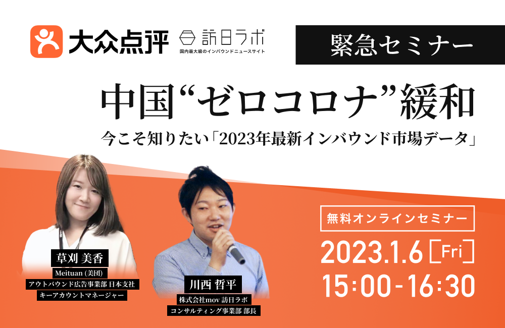 国内最大級のインバウンド総合メディア「訪日ラボ」を運営する株式会社mov(代表取締役:渡邊 誠、本社:東京都渋谷区、以下mov)は、中国の大手テック企業「美団」日本支社にて、中国最大級のライフサービス検索プラットフォーム「大衆点評」をご担当されている草刈 美香氏をお迎えし、2023年の中国国内の動向予想やインバウンド市場データに関するセミナーを開催します。