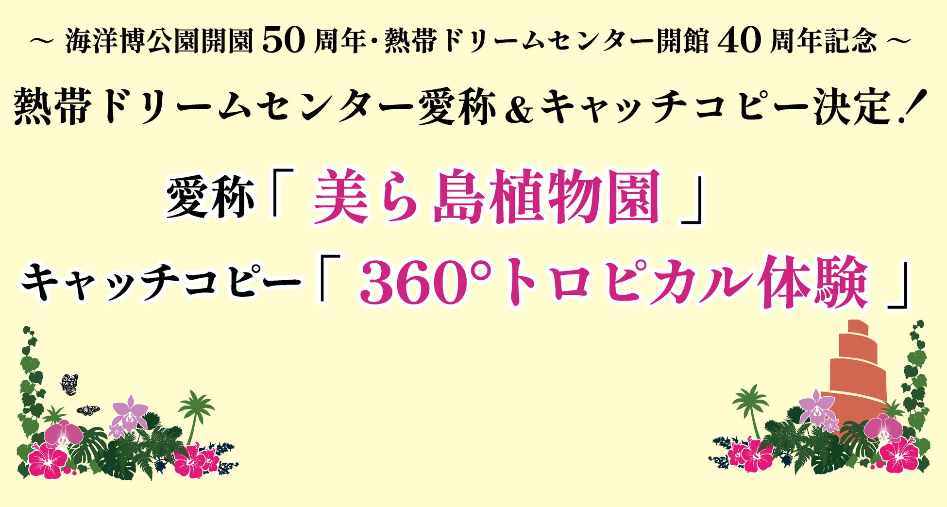 海洋博公園 熱帯ドリームセンターは、令和8年2月8日に開館から40周年を迎えました(昭和61年2月8日開館)。この節目の年にあたり、沖縄県民をはじめ国内外から訪れる来園者に、より親しみやすく分かりやすい施設として認知されることを目的に、愛称とキャッチコピーを一般公募し、愛称応募総数848点、キャッチコピー応募総数846点の中から、それぞれ決定しました。