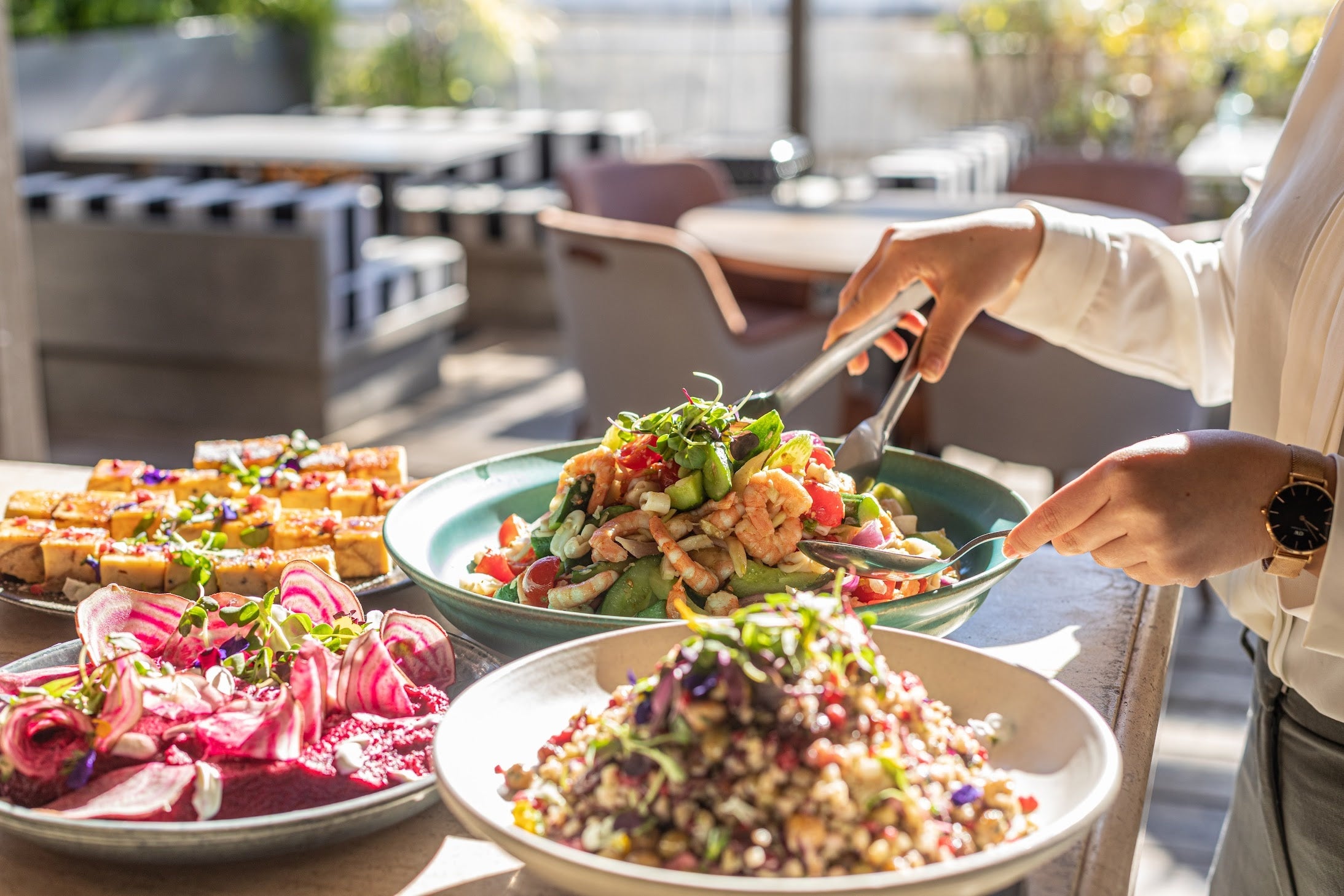 地元町田産のフレッシュ野菜を使用したサラダビュッフェや、こがさかベイクで焼き上げる自家製パンに加え、