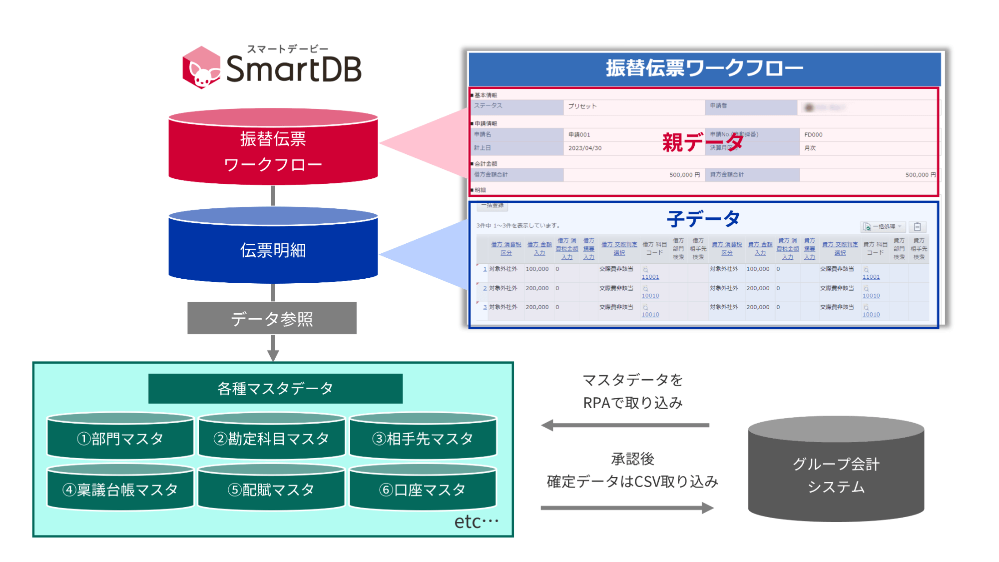 現在は、会計業務のフロントシステムとして「振替伝票業務」「請求書支払業務」などのデジタル化に向けてシェアードサービスセンターを中心にSmartDB(R)で開発中です。 「振替伝票業務」「請求書支払業務」では、10を超える各種マスタと紐づいた伝票をSmartDB(R)で申請・承認。 承認されたデータをグループ会計システムに連携させる一気通貫した会計業務のデジタル化を予定しています。