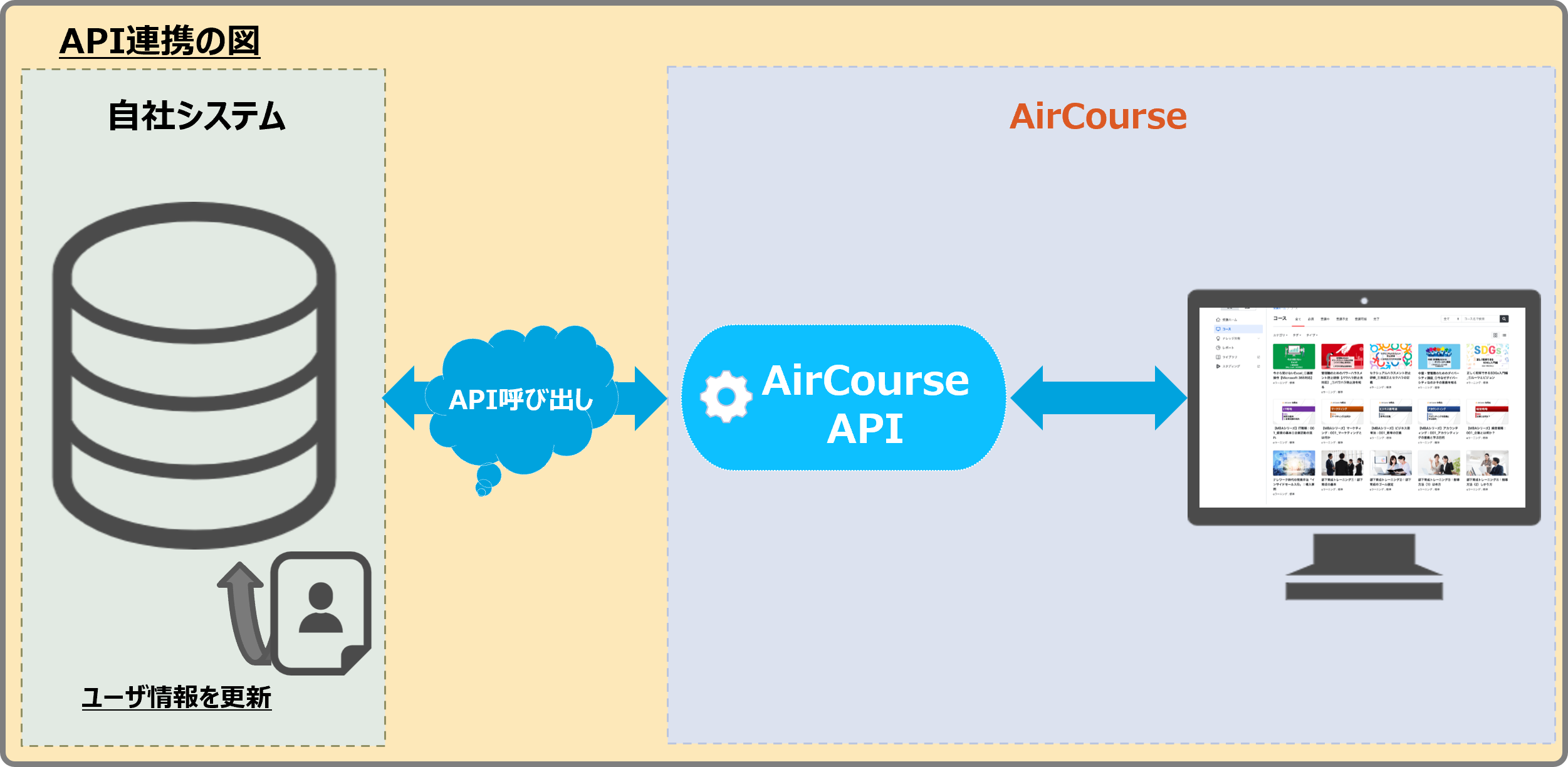 APIを活用すると、従来AirCourse管理者が手動で実施していたユーザの追加、所属組織の変更等のユーザ情報の変更について、自社システムと連携することで自動化できます。