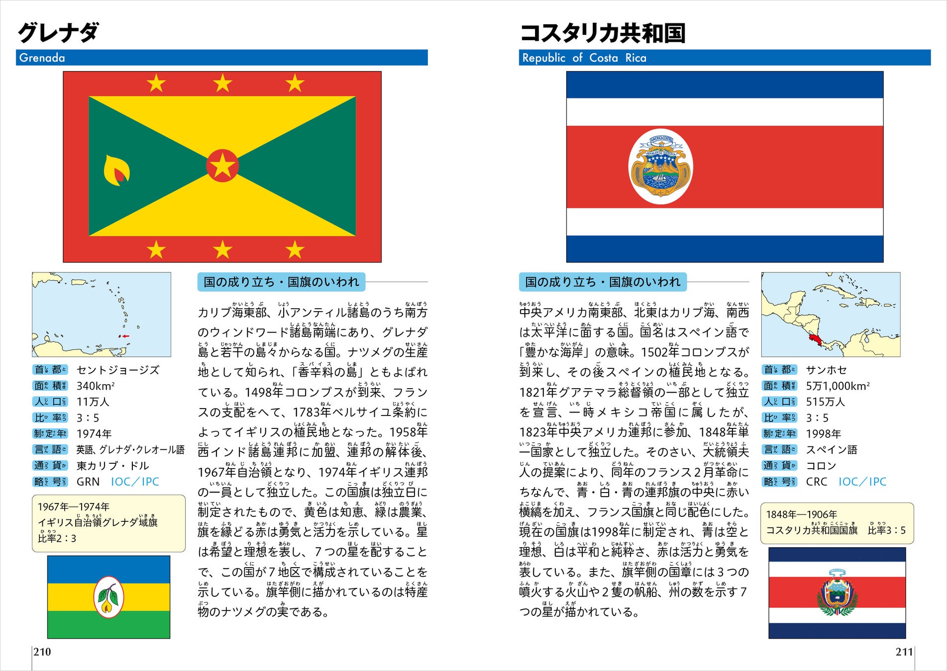本書は、1ページごとにひとつの国を紹介する構成で、国の場所がわかる地図や、首都、面積、人口、言語など、国の基本情報がひとめでわかるほか、「国の成り立ち、国旗のいわれ」としてその国・地域の大まかな歴史と国旗の由来、国や地域の歴史とともに進化する国旗のうつりかわりも記されています。主な旧旗は、画像とともに紹介しています。