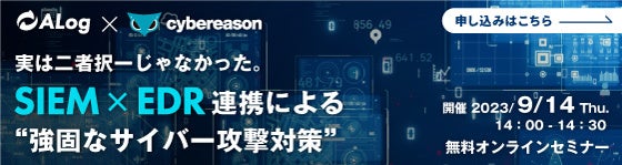 9/14(木)開催の本ウェビナーでは、ALogとCybereason EDRの連携により実現する、より強固なサイバー攻撃対策について詳しくご紹介する予定です。お気軽にご参加ください。