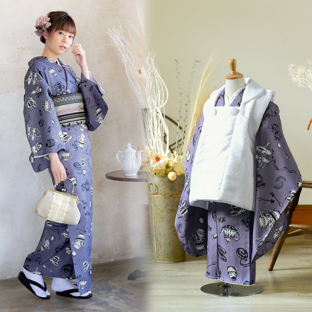 細かな地模様のある生地。グレイッシュな鈍い青紫色の地に、黒の線で表現された茶器やお菓子、フルーツなどアフタヌーンティーの品々を散らした模様。部分的に白く抜いた柄が際立って見えます。ペン画調のカップやケーキ、マカロン、レモンなど見ているだけでお茶会の楽しさをイメージさせるデザインです。被布コートは白です。