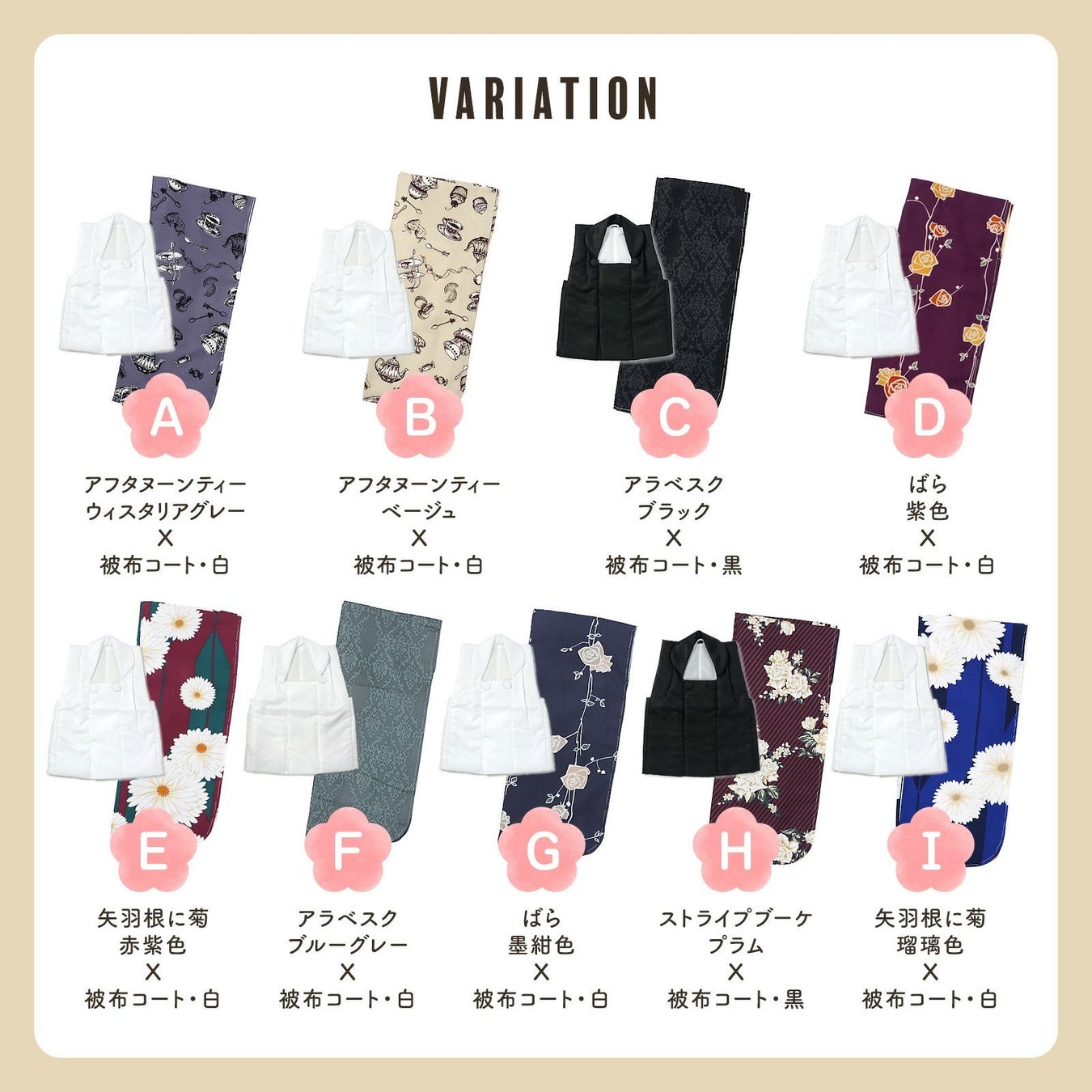 三歳コートにコーディネートする被布コートもKIMONOMACHIオリジナルで制作しています。白と黒と2色展開です。白と黒のどちらかを着物にコーディネートしています。シンプルでモダンなデザインに、光の加減で浮かび上がる入れ子菱に花菱の地模様がが上品な一着です。ふんわり綿入りの衿とやわらかな曲線が、愛らしさを引き立てます。セットの被布コートは着物とコーディネート済みです。
