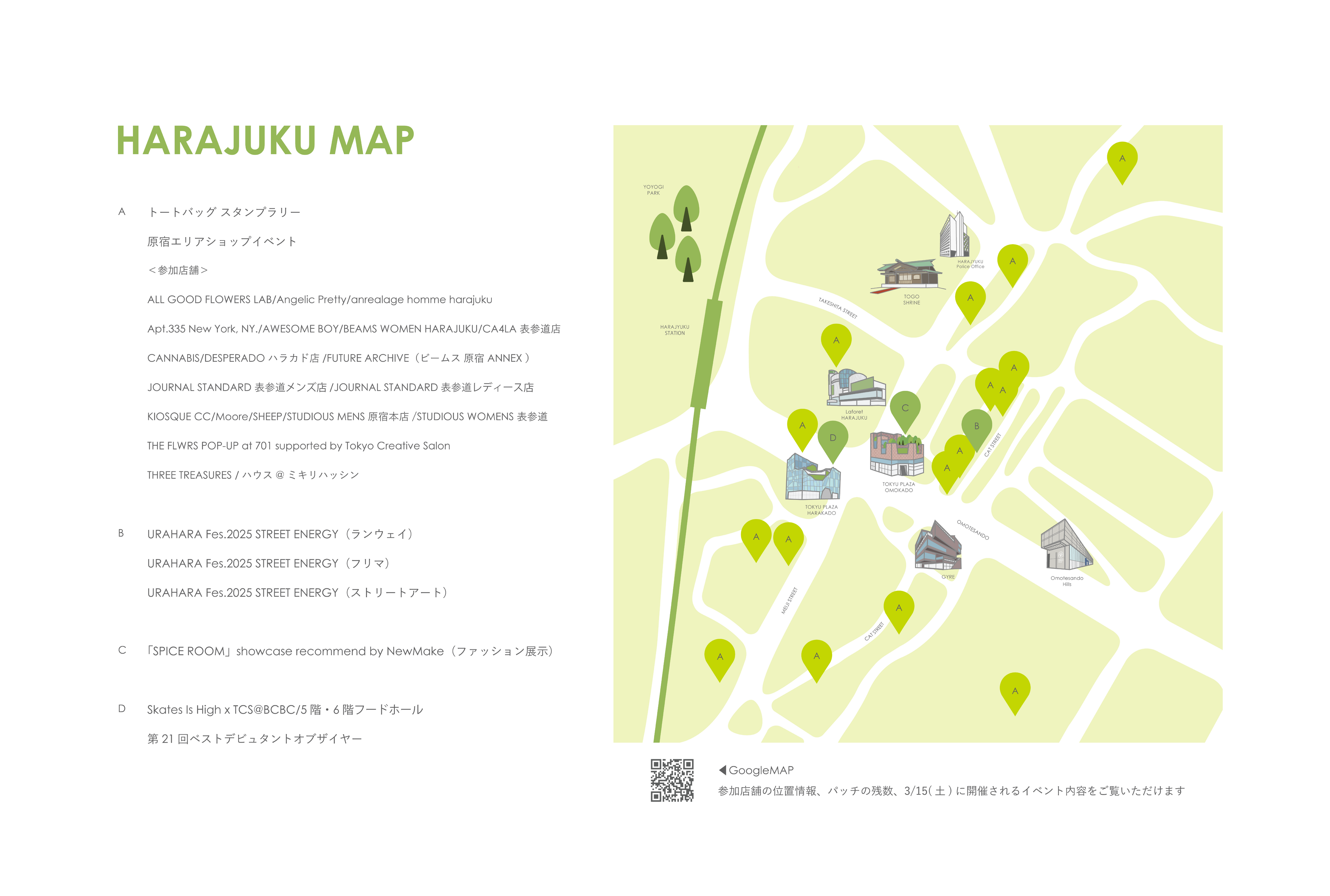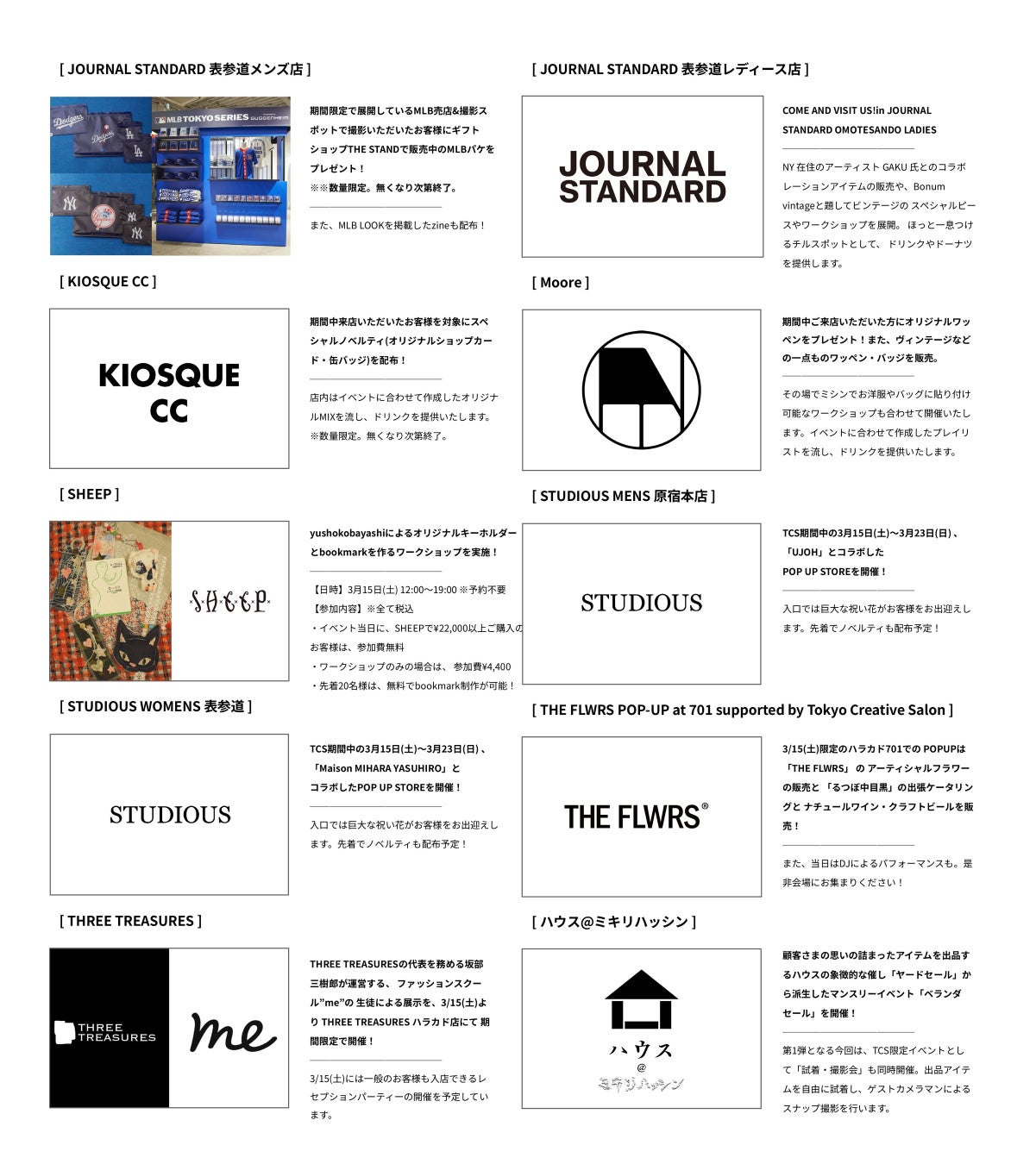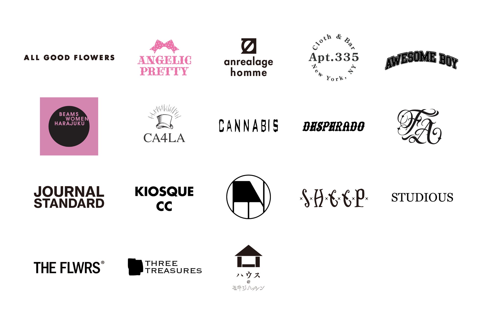 ALL GOOD FLOWERS LAB / Angelic Pretty / anrealage homme harajuku / Apt.335 New York, NY. / AWESOME BOY / BEAMS WOMEN HARAJUKU / CA4LA 表参道店 / CANNABIS / DESPERADO ハラカド店 / FUTURE ARCHIVE(ビームス 原宿 ANNEX )/ JOURNAL STANDARD 表参道 Mens / JOURNAL STANDARD 表参道 LADIES / KIOSQUE CC / Moore / SHEEP / STUDIOUS MENS 原宿本店 / STUDIOUS WOMENS 表参道 / THE FLWRS POP-UP at 701 supported by Tokyo Creative Salon / THREE TREASURES / ハウス@ミキリハッシン