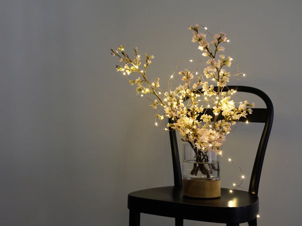 右上: 100円均一でも入手可能なガーランド状のLEDライトを枝に巻いて夜桜風オブジェに。夜桜ライトアップをご自宅で楽しみましょう。
