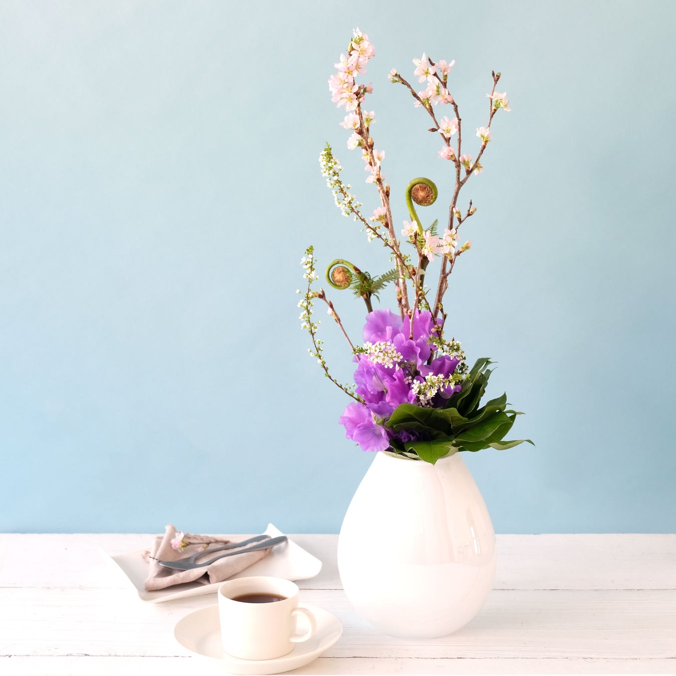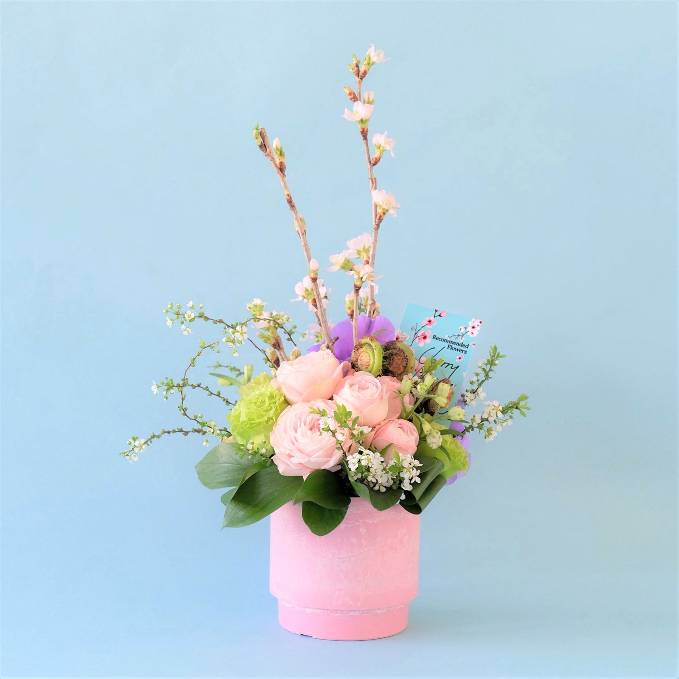 ぎゅっと詰め込んだ季節の花々と伸びやかな桜のコントラストが美しいアレンジメント。ギフトやご自宅用にもおすすめです。