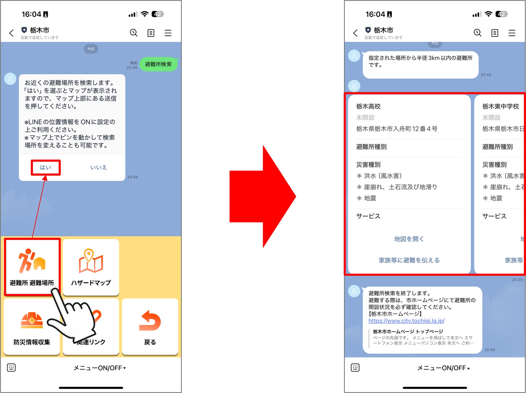 今回栃木市のLINE公式アカウントでは「避難所検索機能」を導入しました。画面の流れに沿って自身の位置情報を送信すると、近くの避難所施設一覧を検索することができます。普段から近くの避難所を確認しておき、いざとなった際にもLINE公式アカウントを利用して、安心して行動することができます。
