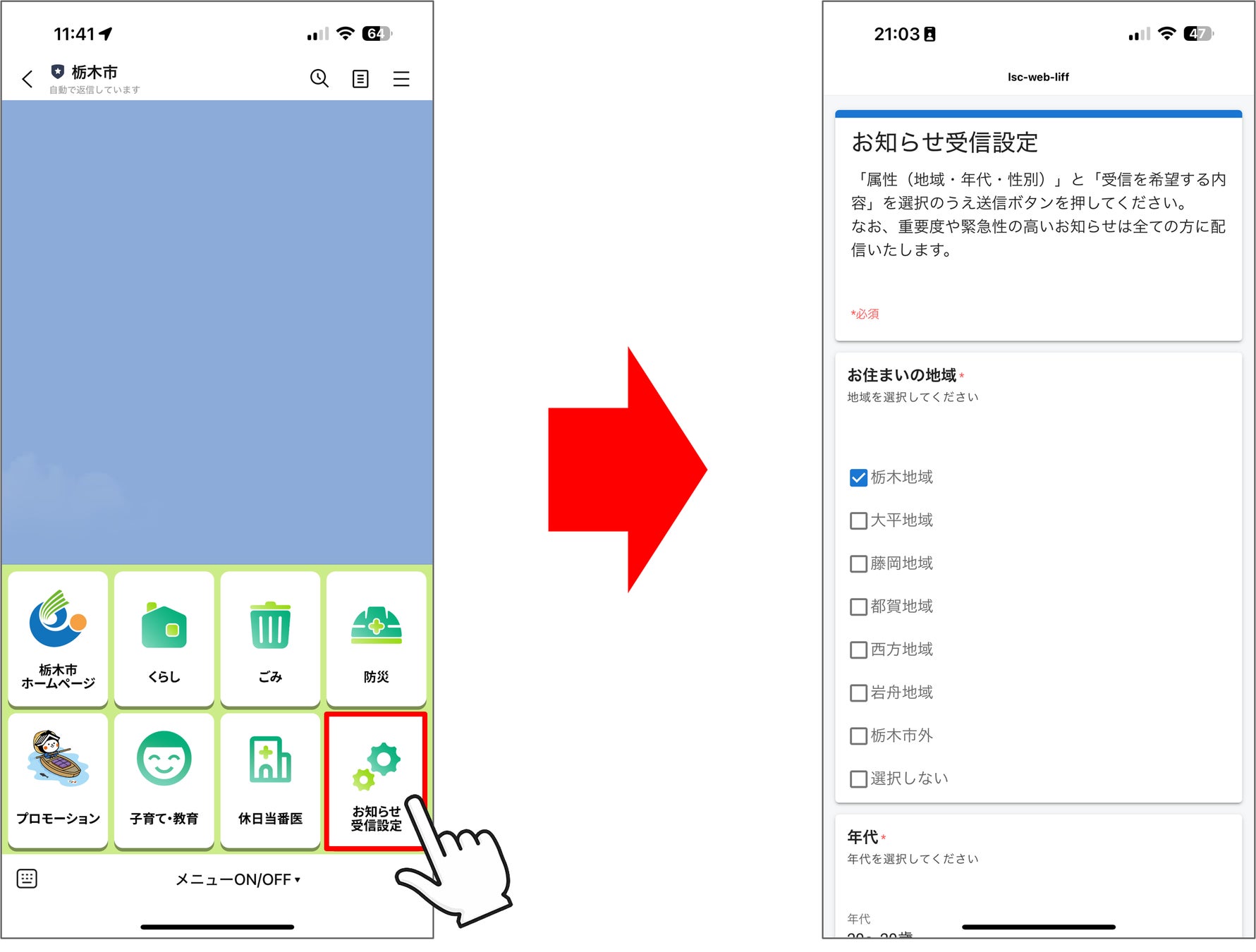 友だち追加をしたユーザーは受信設定に回答することで、受け取る配信の情報カテゴリーをカスタマイズすることができます。あわせて「居住地区」「年代」「性別」に回答することで、属性情報にあわせた情報を効果的に受信することができ、重要な情報を逃しません。