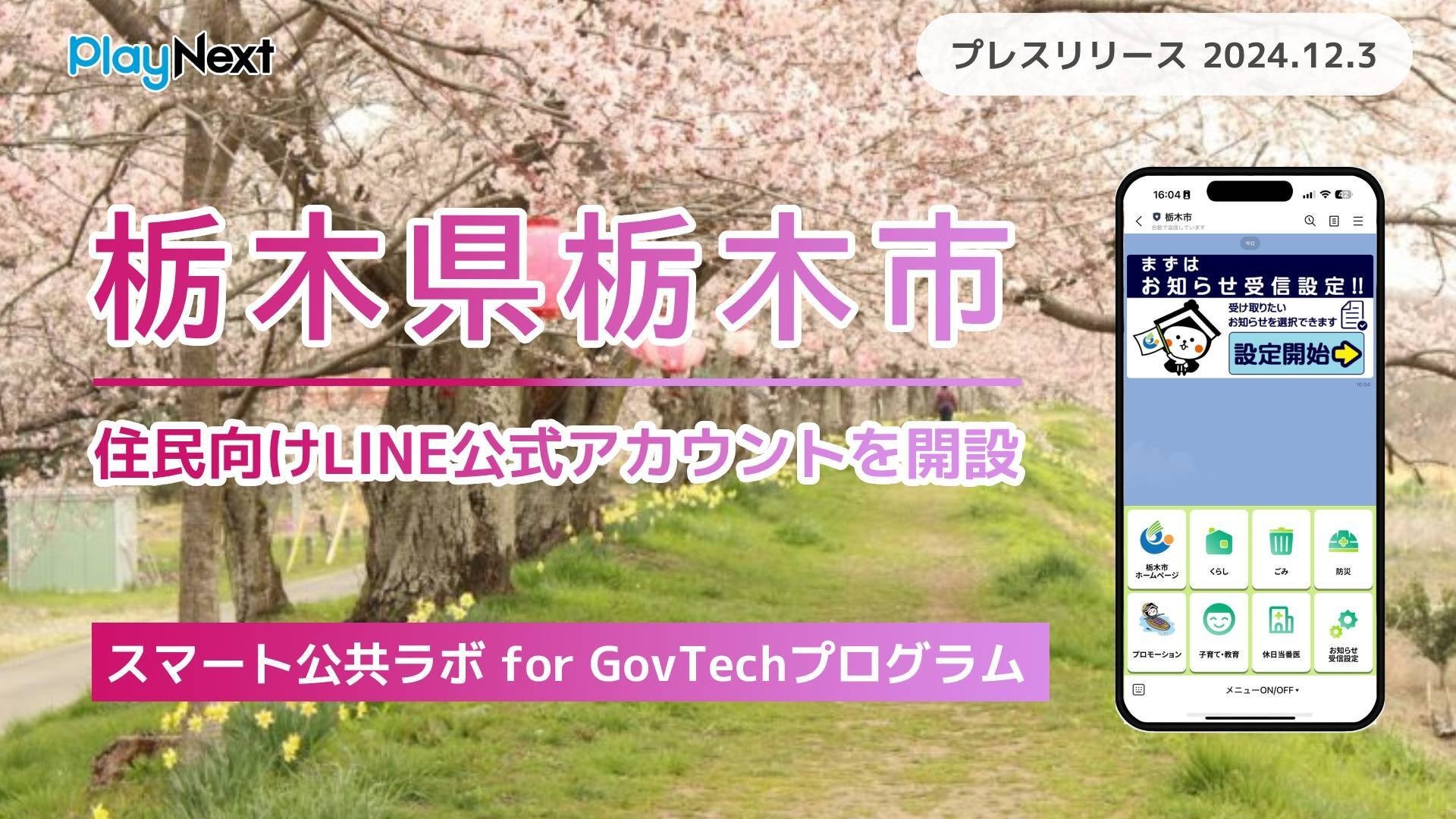 プレイネクストラボ株式会社(本社:東京都品川区、代表取締役:柏 匠、以下 「プレイネクストラボ」)の提供する「スマート公共ラボ for GovTechプログラム」が、栃木県栃木市(以下「栃木市」)のLINE公式アカウントに採用され、2024年12月3日(火)より一般公開したことをお知らせします。