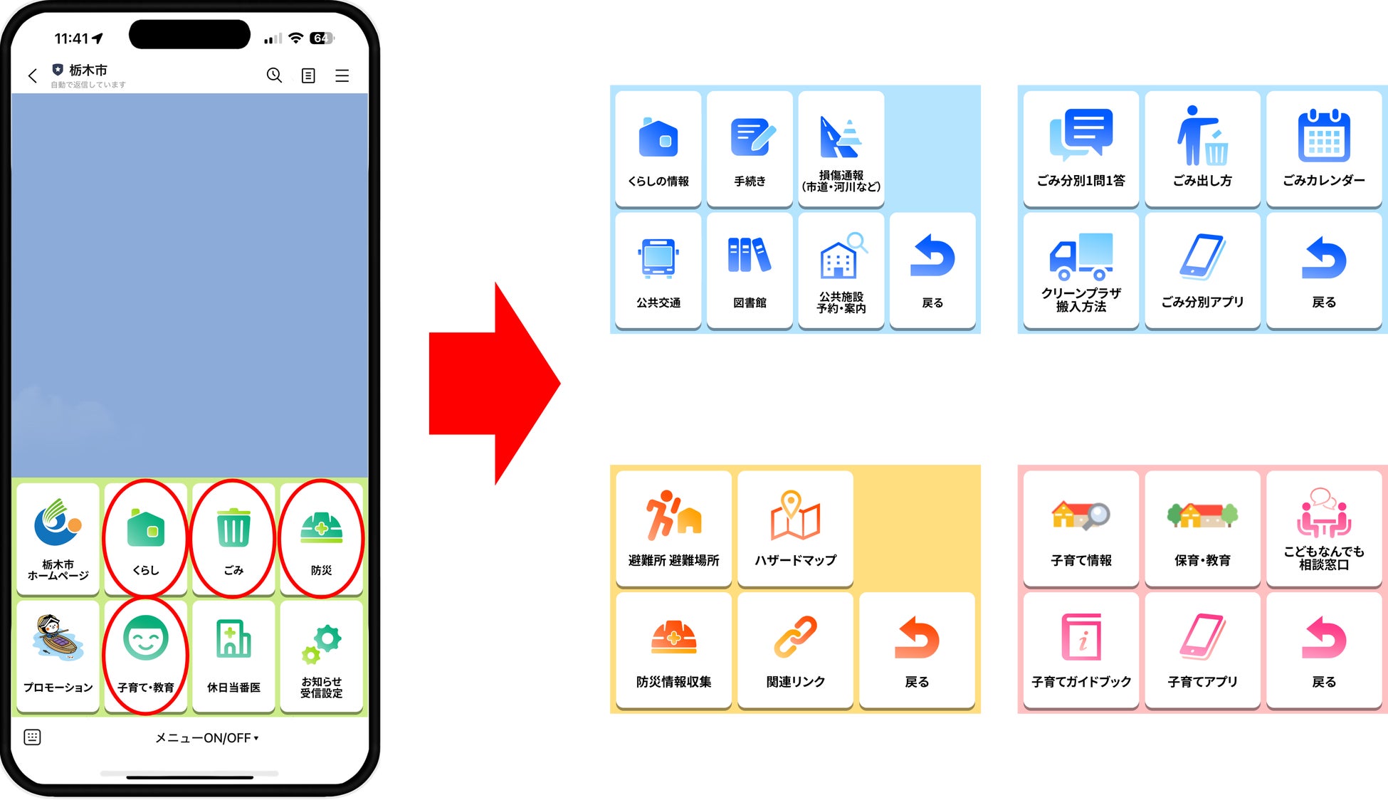 トーク画面下部に固定されているメインメニューを含め「くらし」「ごみ」「防災」「子育て・教育」の計5つのメニューを設置しました。ボタンをタップして起動できるチャットボットの案内にしたがって、各種市政情報を確認することができます。従来はホームページを検索し、該当ページにアクセスすることで取得できた情報ですが、今後はLINEのトーク画面から手軽に情報源にたどり着くことができます。
