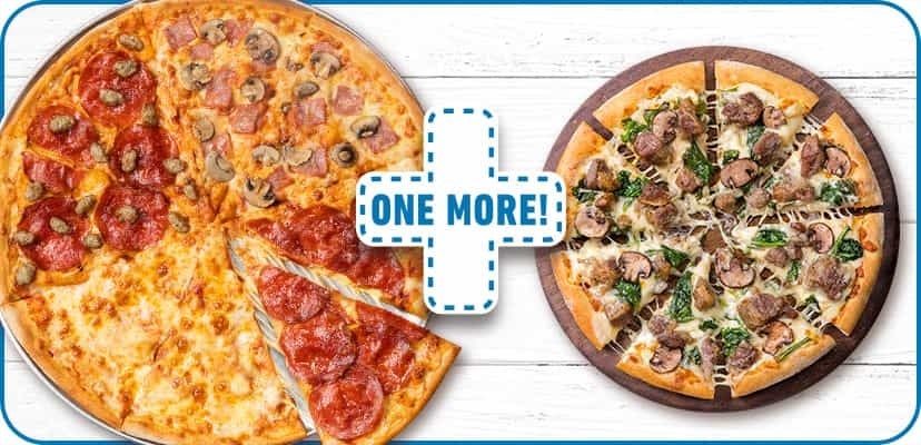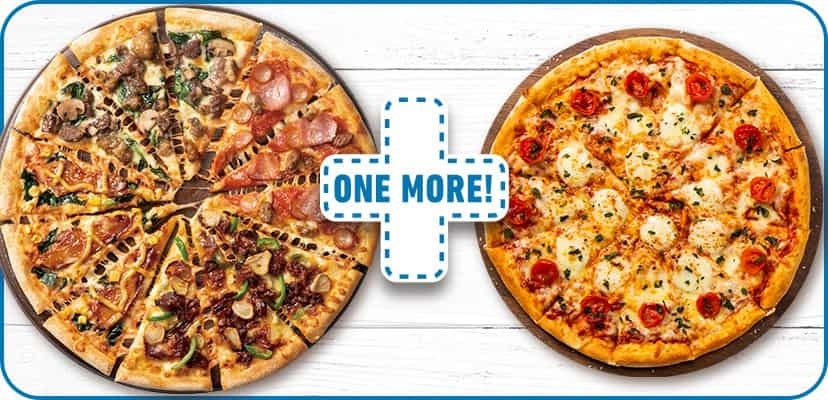 どのサイズでも、どのピザでも、デリバリー1枚買うともう1枚無料に!