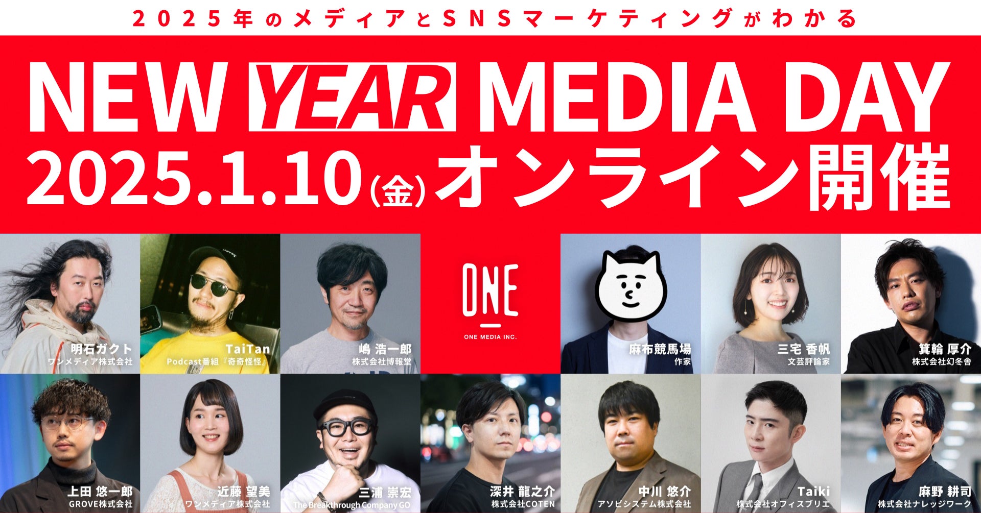 ワンメディア株式会社(本社所在地:東京都渋谷区、代表取締役CEO:明石ガクト、以下「ワンメディア」)は、2025年1月10日(金)12時より、無料ウェビナー『NEW YEAR MEDIA DAY』を開催いたします。なお、本ウェビナーは500名限定、参加費無料、事前お申し込み制となっております。
