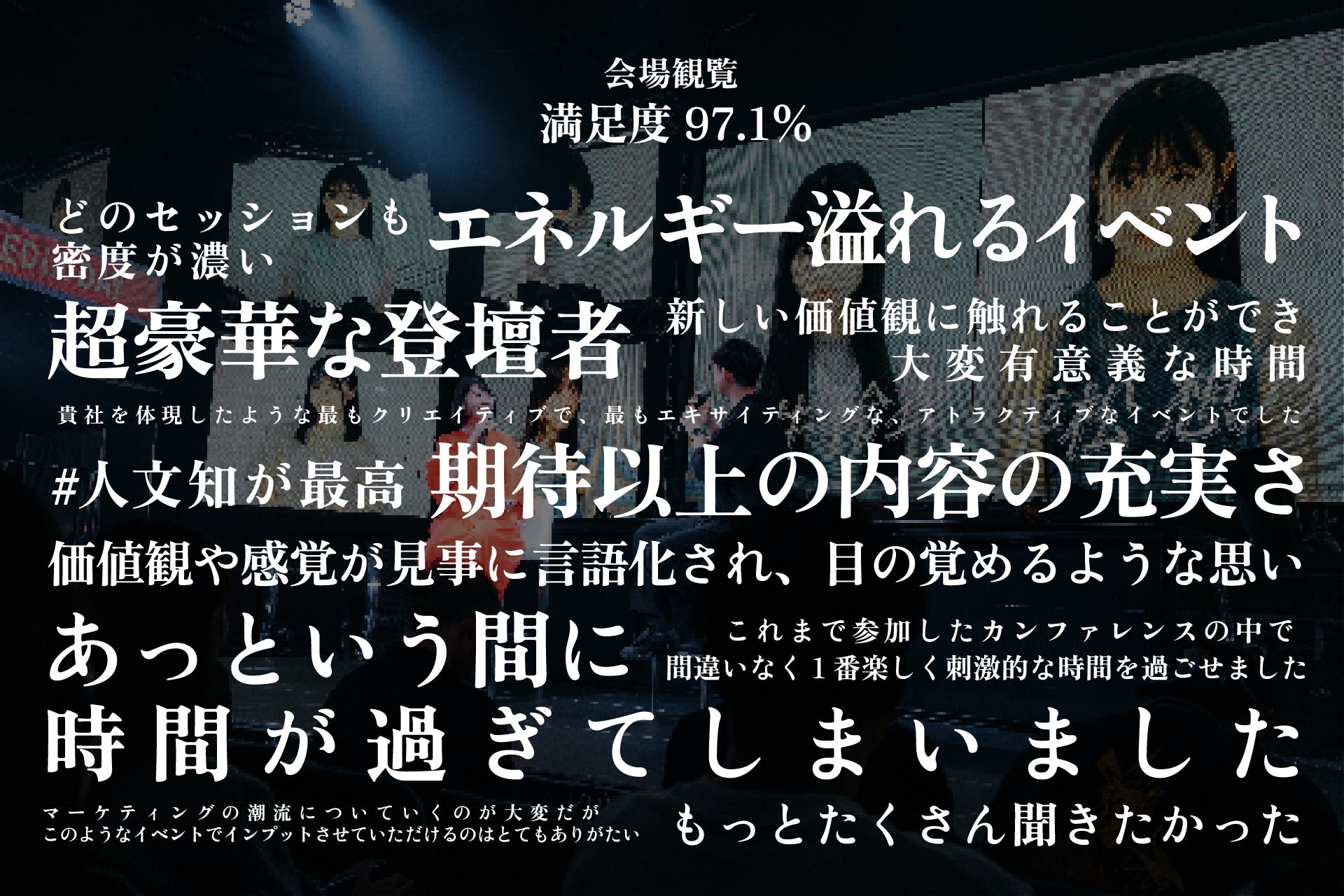 完全招待制で実施したクローズイベントとして2024年11月1日(金)に開催した『NEW MEDIA DAY 2024』の公開収録の来場者満足度は97.1%という結果に。また「どのセッションも密度が濃く、新しい価値観に触れることができ大変有意義な時間であった」、「情報や流行、マーケティングの潮流についていくのが大変だが、このようなイベントでインプットできるのは、とてもありがたい」といった嬉しいコメントを多く頂戴しております。