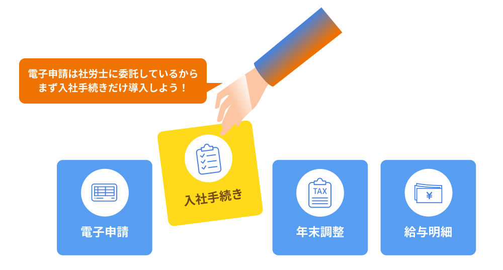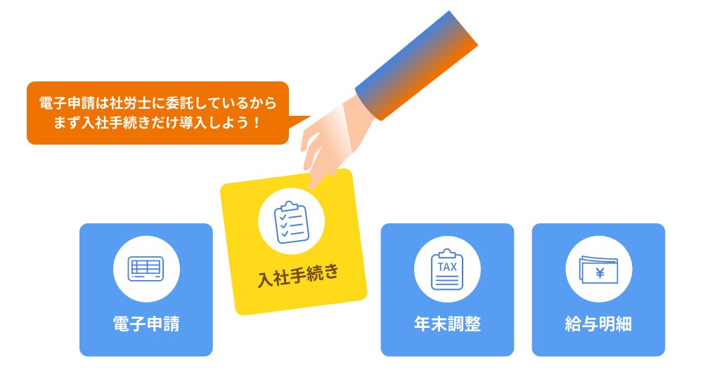 本サービスでは、入社手続き、年末調整、給与明細、電子申請の4つの労務管理業務をペーパーレスで完結できます。書類のやり取りに伴う煩雑な業務を削減するとともに、使いやすい操作性で業務を効率化します。