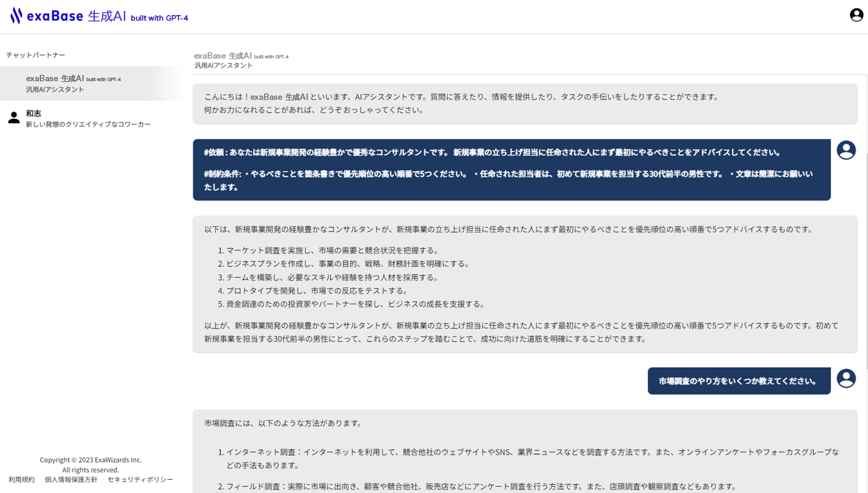 画面:exaBase 生成AI built with GPT-4のプロンプト画面(開発中のものであり提供時は異なる場合があります)