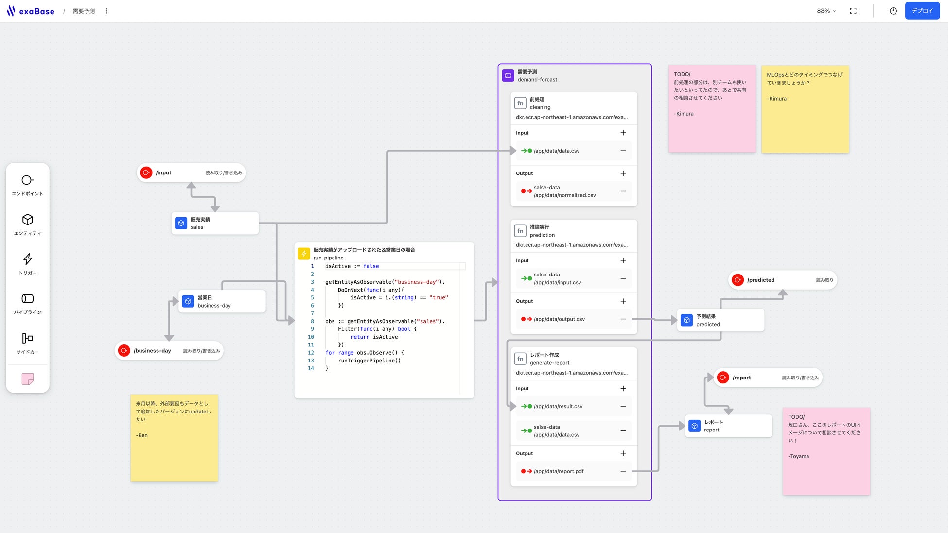 エクサウィザーズは企業ユーザーがAIソフトウェアを容易に開発できる「exaBase Studio」を今期(2024年3月期)中に投入予定です。exaBase Studioではキャンバスと呼ぶ開発画面に、AIアルゴリズムや処理、入力データなどを定義できるソフトウェア開発環境です。キャンバスを利用して、ビジネス部門の担当者とエンジニア・開発者などのステークホルダーが目標を共有しながら、アジャイル型で迅速に構築し、その後の環境変化に応じて進化させることもできます。