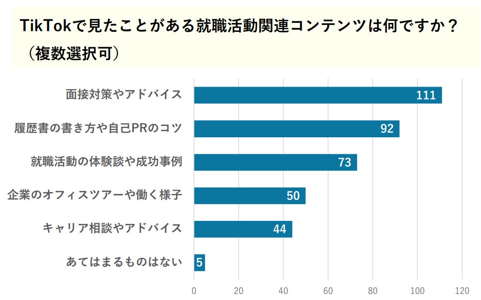 その中でも「面接対策やアドバイス」「履歴書の書き方や自己PRのコツ」などのノウハウ系のコンテンツがよく見られていることから、具体的な例や実践的なアドバイスを求めており、TikTokの短い動画でポイントを押さえた情報が非常に役立つと感じていると推測されます。