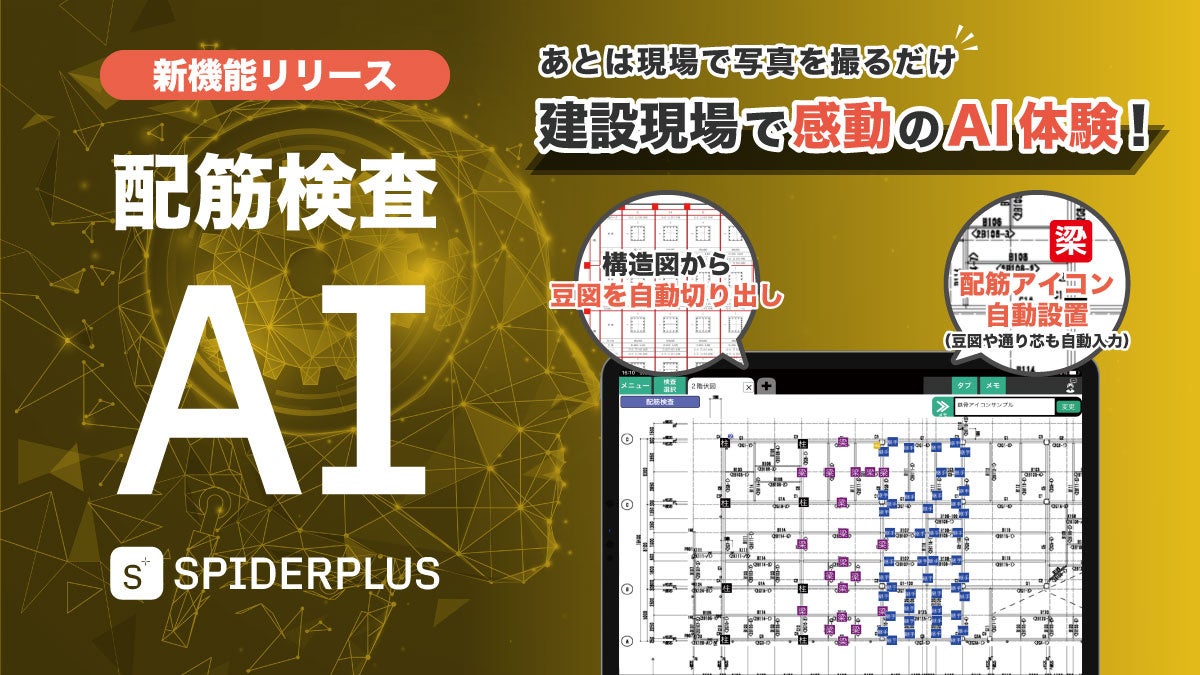 スパイダープラス株式会社は、自社特許技術(※1)を活用した、建築工事の品質管理で行う配筋検査の事前準備作業を自動化するAI機能(以下「本機能」)を、8月21日より提供することをお知らせいたします。