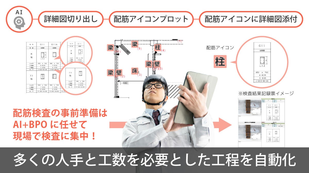 なお、BPOサービスでは本機能活用時の精度をさらに高めるための作業を請け負うことにより、SPIDERPLUSで配筋検査を行うお客様が、さらにラクに、正確に検査業務を進めていくことができるよう、支援してまいります。