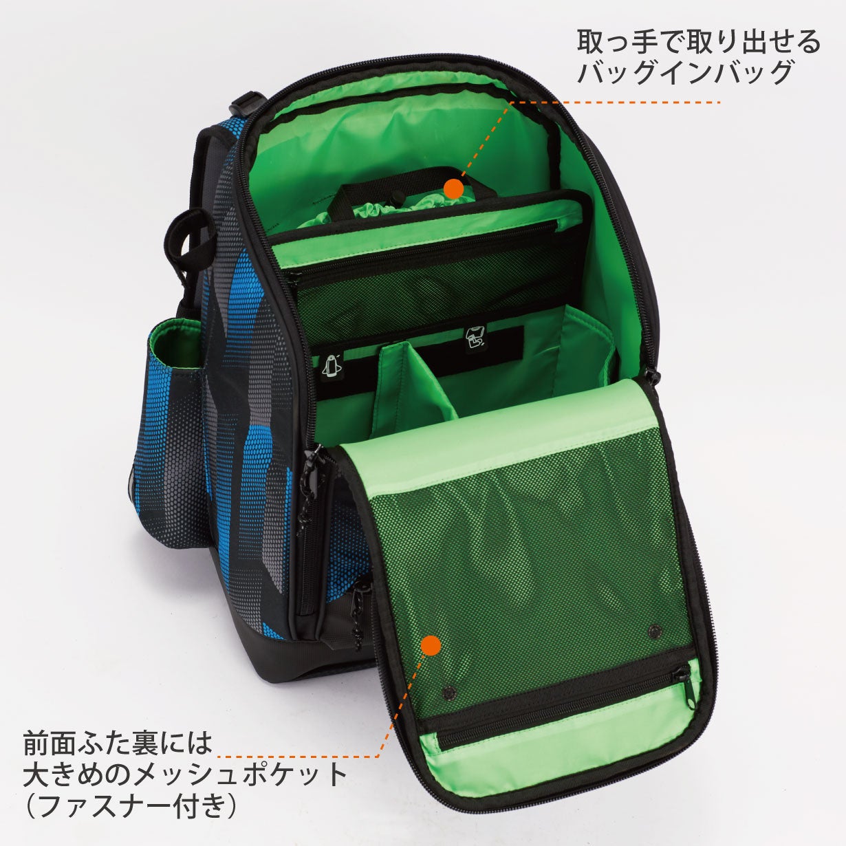 新発想のバッグインバッグを採⽤。ヘルメットの外付け用パーツや、巾着タイプのポケット、水筒のサイズによって調整可能な仕切りを付けたポケット、保冷機能を付けたお弁当用のスペースなどお子様が楽しみながら整理して大事な用具を持ち運べるよう工夫が施されています。