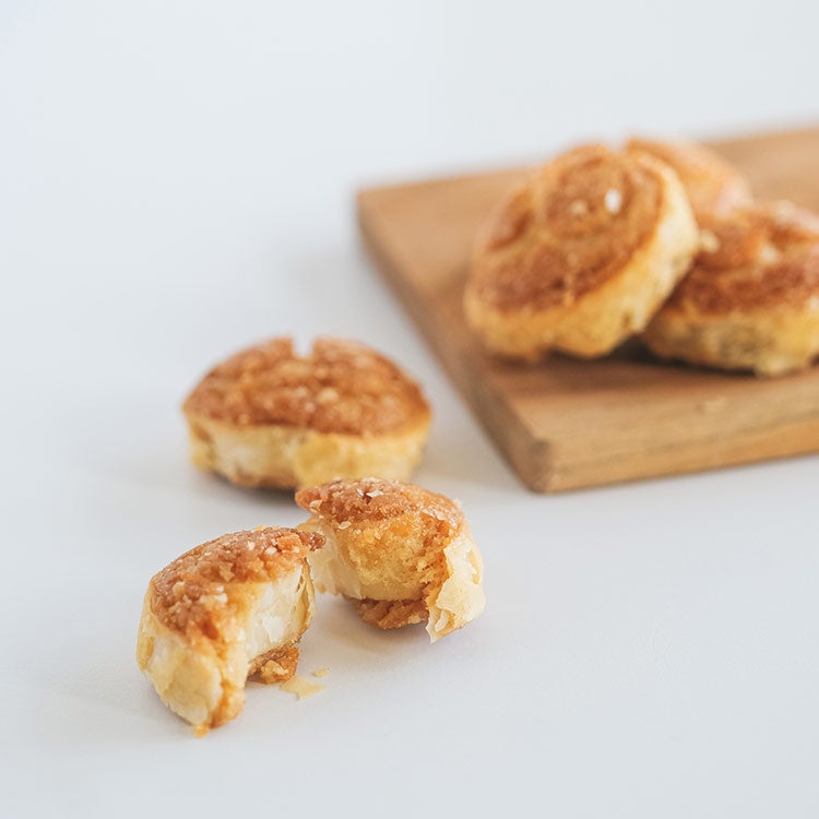 北海道産発酵バターときび糖で丁寧に折り上げた優しい甘さのパイです。丸みを持たせたことで厚みが生まれ、ざくっとした歯触りの仕上がりになっています。原材料がシンプルな分、素材の美味しさを感じていただきやすいおやつです。