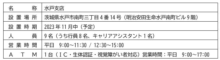 2019年10月に開設した「水戸法人営業所」は、開設から3年7か月が経過し、お客さまとのお取引が順調に拡大していることから、この度、同法人営業所の業務を承継・拡大させるかたちで「水戸支店」を新設することとしたものです。